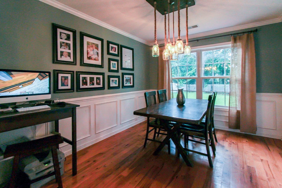 The formal living area and dining area are connected, providing an open flow through both rooms, highlighted by the wood floors that can be found throughout the space. Both rooms are spacious and bright, with windows throughout.
